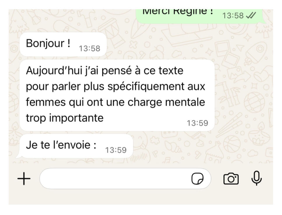 Chaque semaine, Régine vous envoie des messages directement via WhatsApp.Des textes prêts à être partagés, pour parler de votre livre.